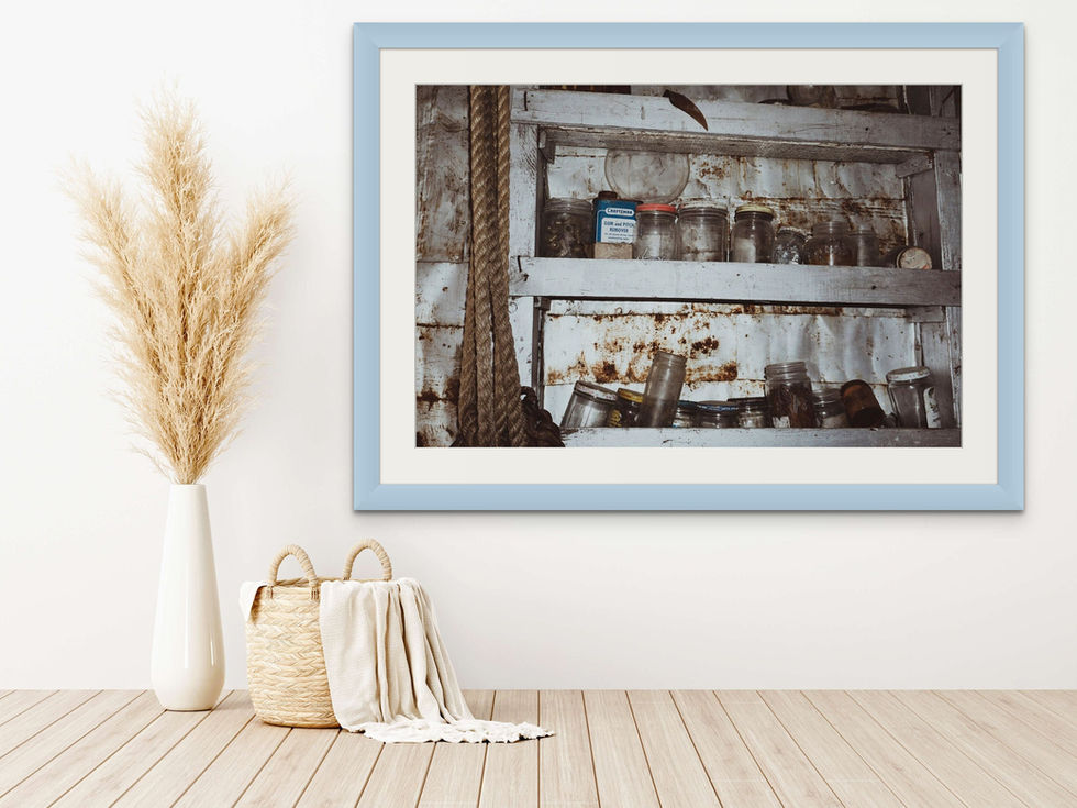 This charming photo print features a rustic shelf adorned with vintage jars and various delightful items, perfect for adding a touch of farmhouse decor to any room. The warm colors and cozy vibe make it an ideal piece for your kitchen or living space, bringing a sense of nostalgia and style.